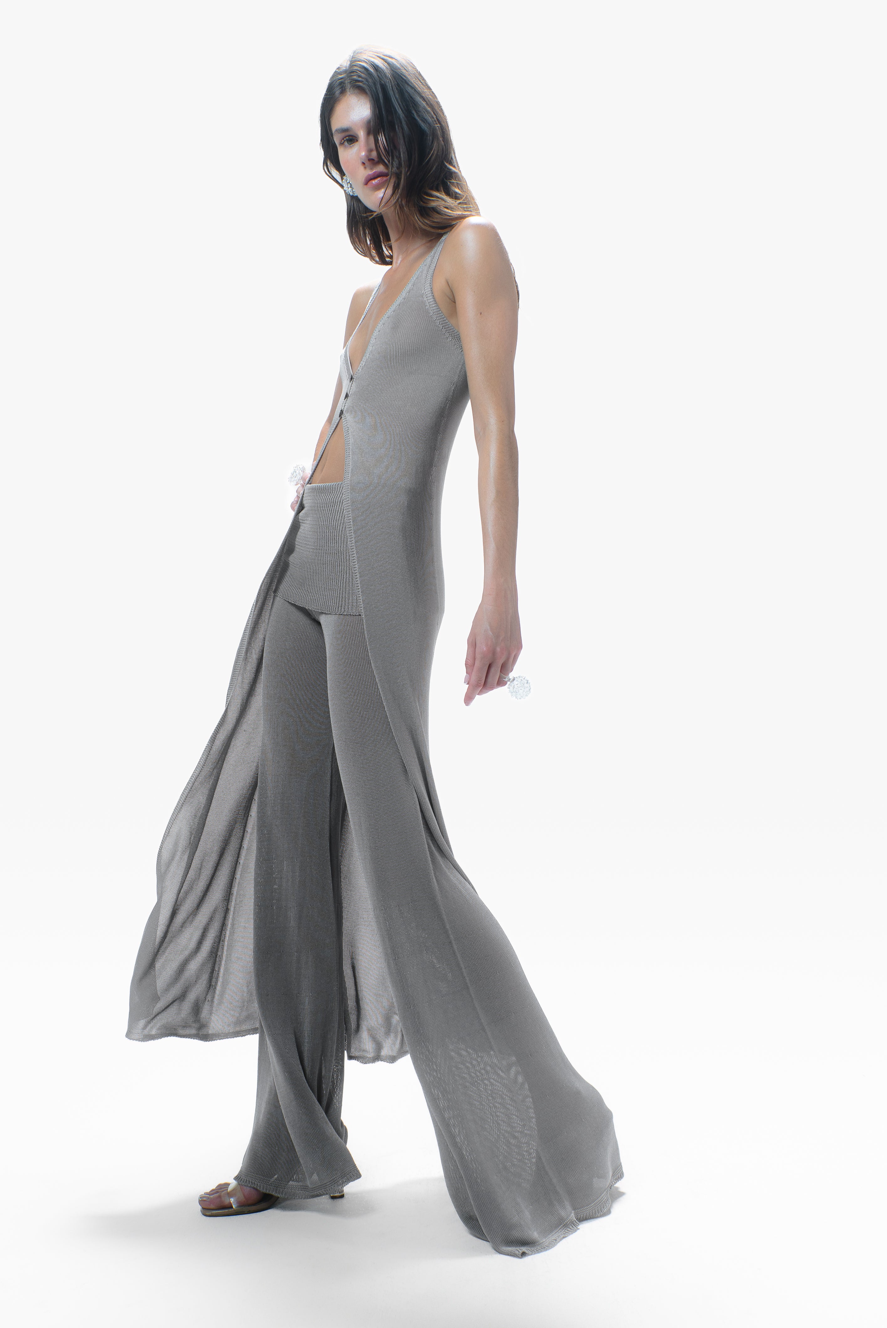 Sheer flared knit pants in a soft, fluid yarn with a breathable open-stitch structure. Designed to sit mid-to-low rise with an elasticated waistband.
