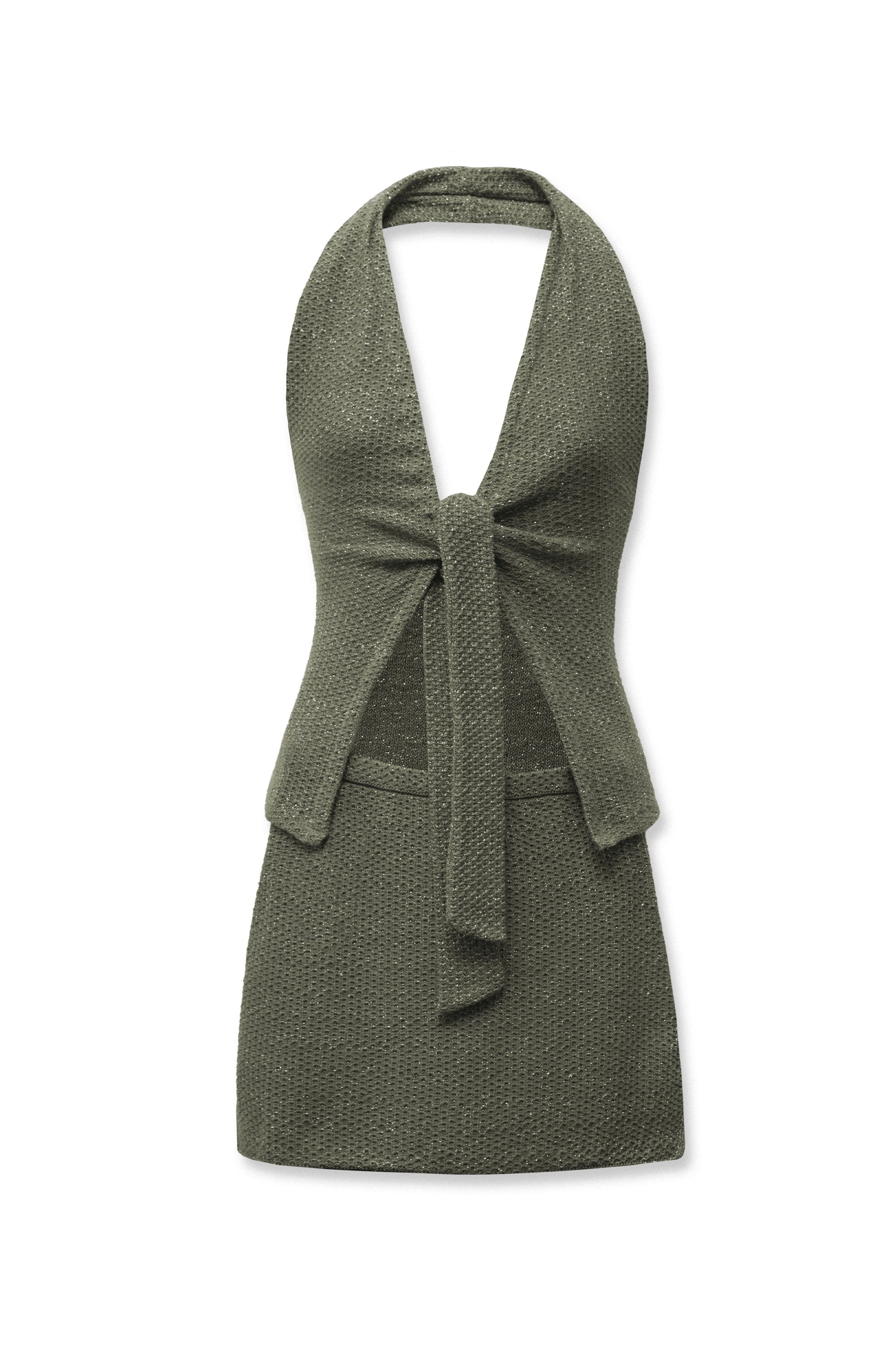 A sleek two-piece cotton set featuring a halter crop top with front tie detailing and a matching mini skirt, crafted in a rich green hue.