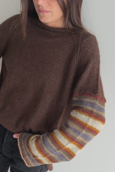 Oversized knit sweater with striped sleeves.