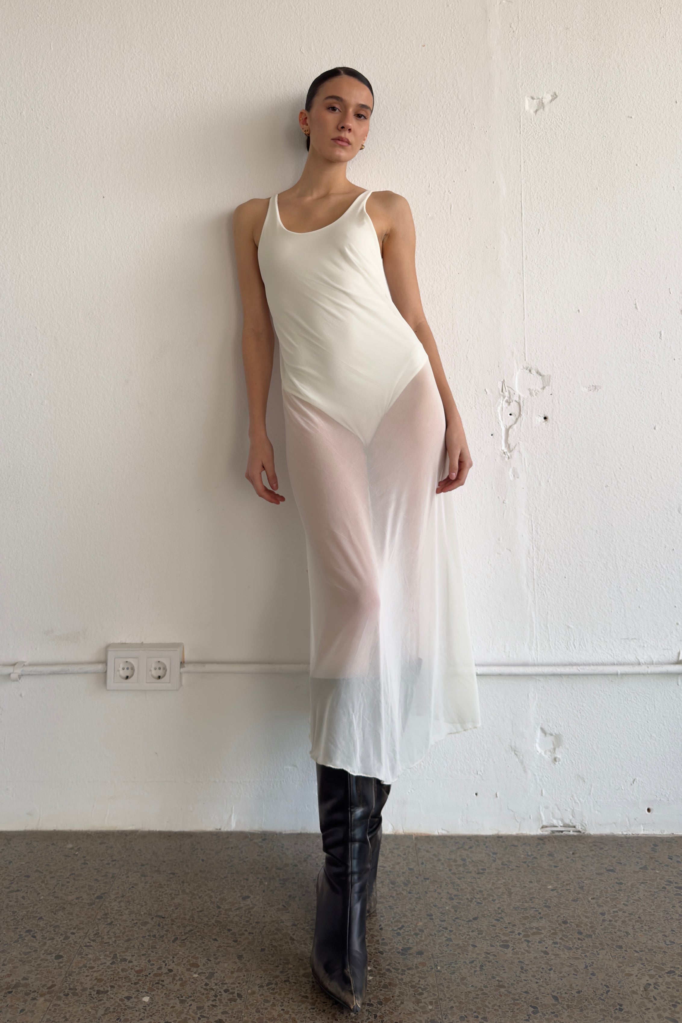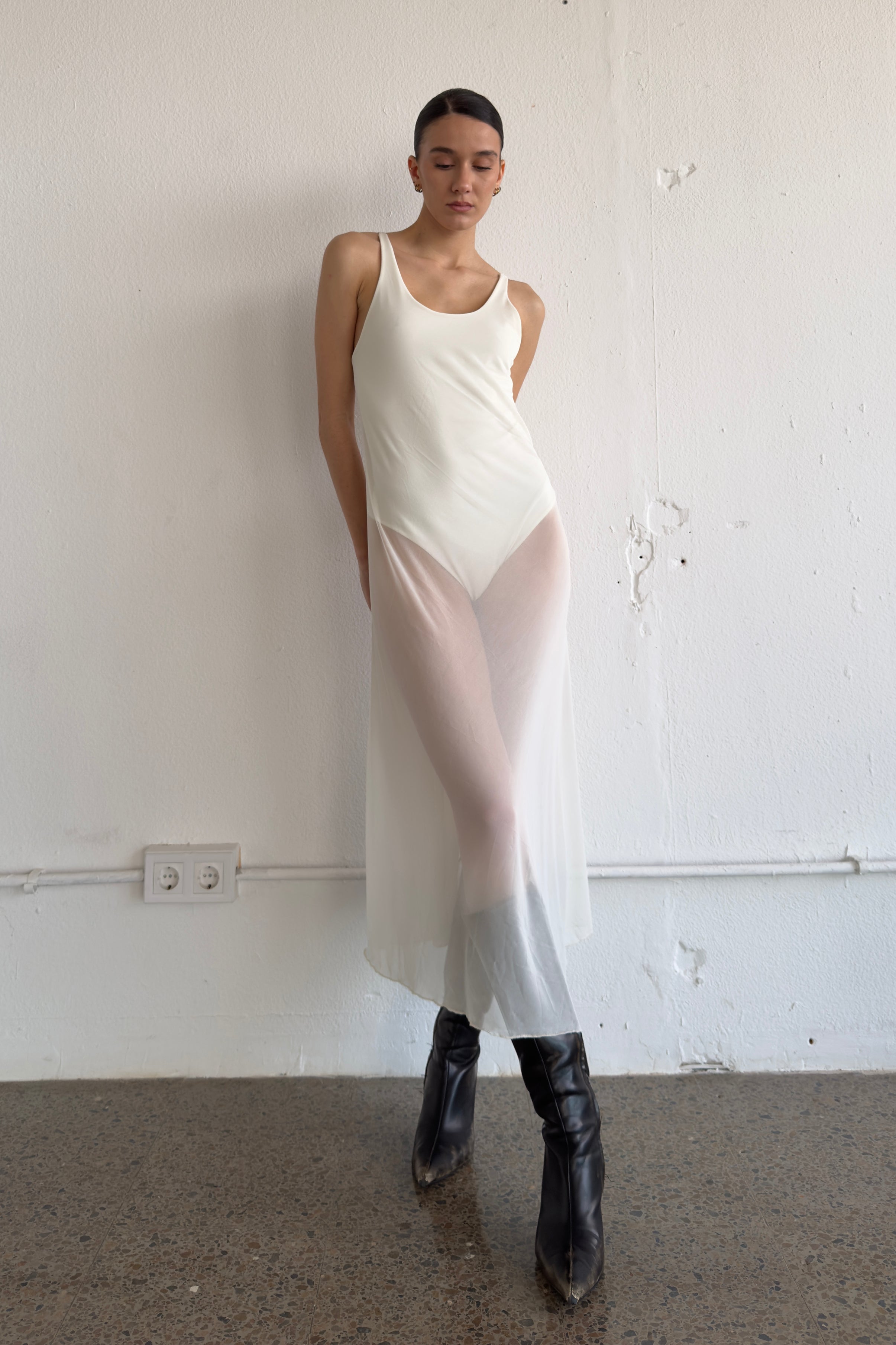 Sleeveless semi-sheer dress with an inlaid bodysuit.