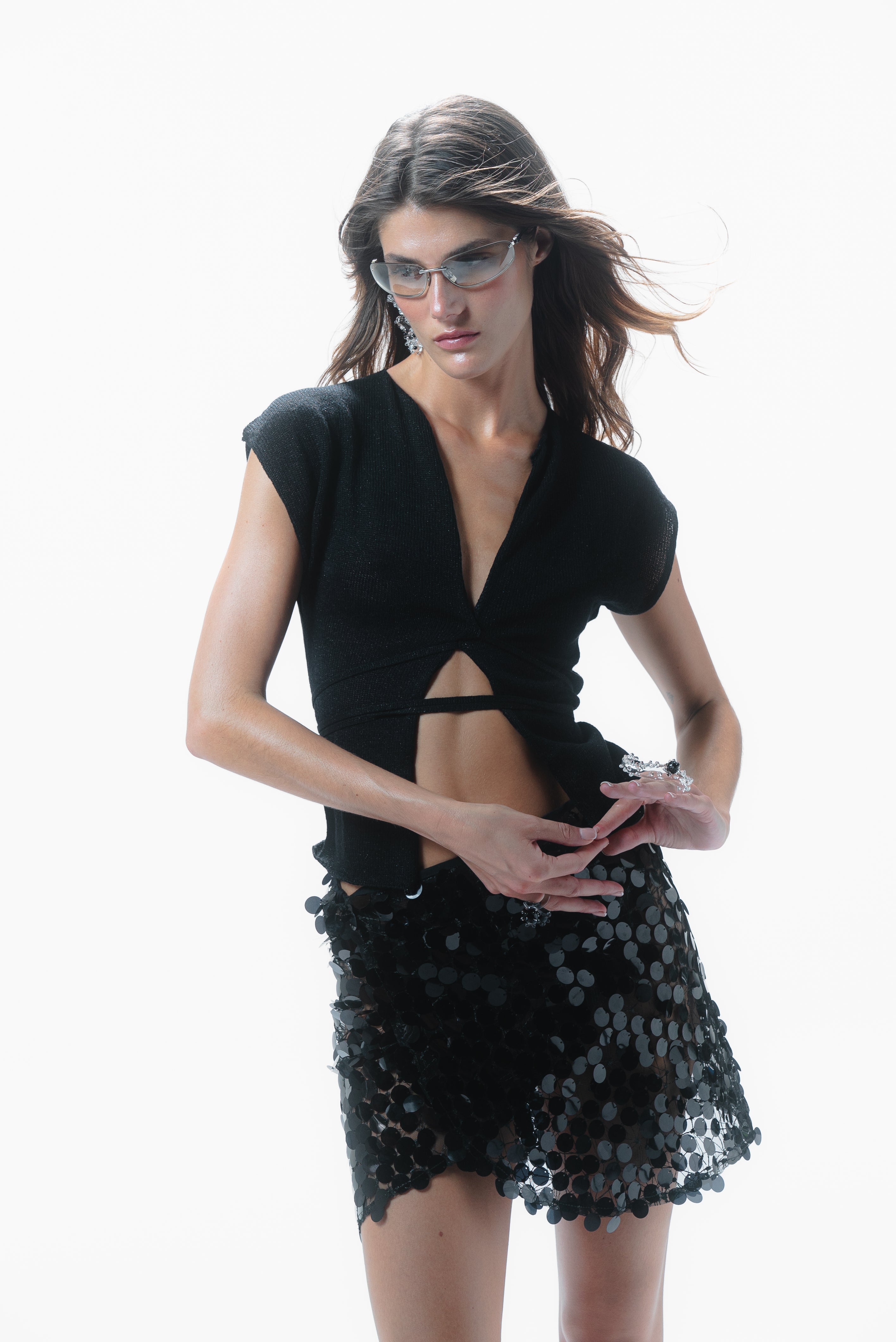 Shimmering black sequin pareo skirt with a semi-sheer finish and adjustable side ties.